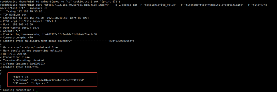 td_value=$(grep -w "td" cookie.txt | awk '{print $7}') curl 'http://192.168.40.50/cgi-bin/file-import' -b ./cookie.txt -F "sessionid=$td_value" -F "filename=type=https&file=certificate" -F "file=@/home/mia/test.crt" --insecure -v |