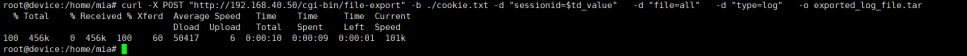td_value=$(grep -w "td" cookie.txt | awk '{print $7}') curl -X POST "http://192.168.40.50/cgi-bin/file-export" -b ./cookie.txt -d "sessionid=$td_value" -d "file=all" -d "type=log" -o exported_log_file.tar |
