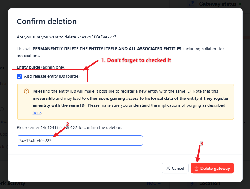 A3: Since your first configuration succeeded, it means your gateway’s Gateway EUI was registered on the platform and came online successfully. However, if subsequent attempts to add it fail regardless of the method used, it indicates that during the deletion process, you did not check the "Also release entity IDs(purge)" option. So, when deleting a gateway, you must check that option to ensure that The Things Industries platform completely clears the data associated with the Gateway EUI. Otherwise, it cannot be re-added.