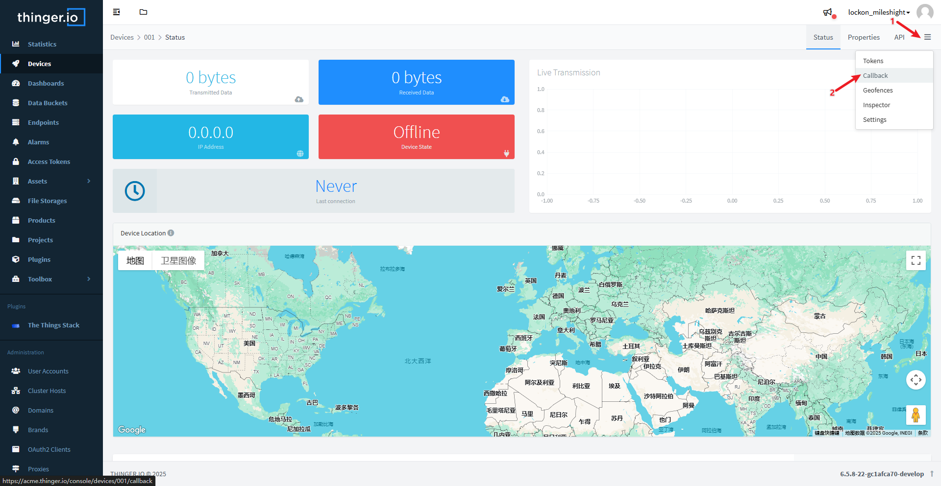 As you can see, the status shows online, and the live transmission is receiving data.