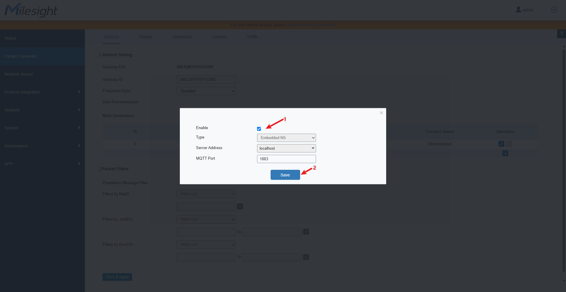 Here, the configuration mainly follows “How to Connect LoRaWAN Nodes to Milesight Gateway”.
