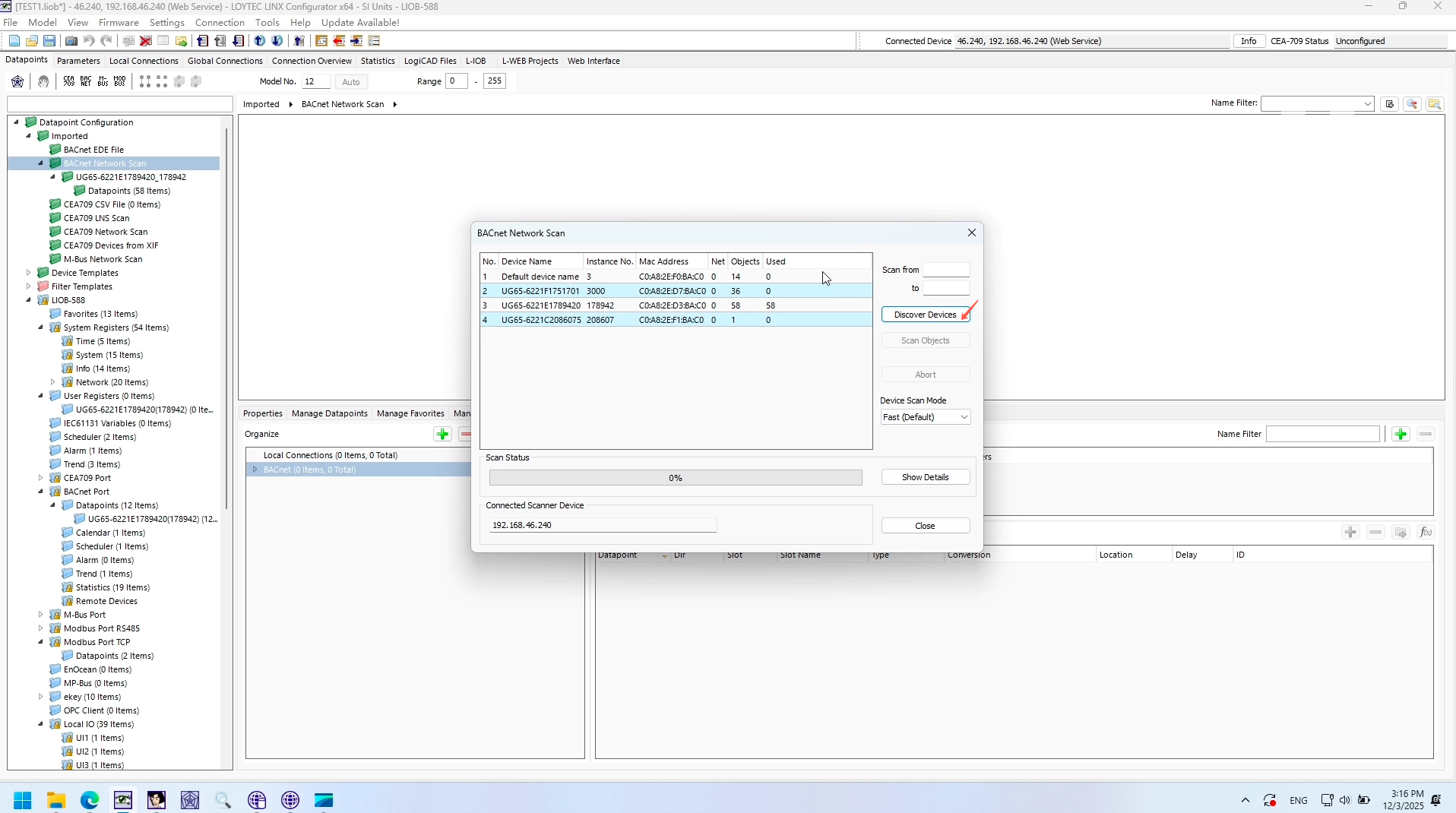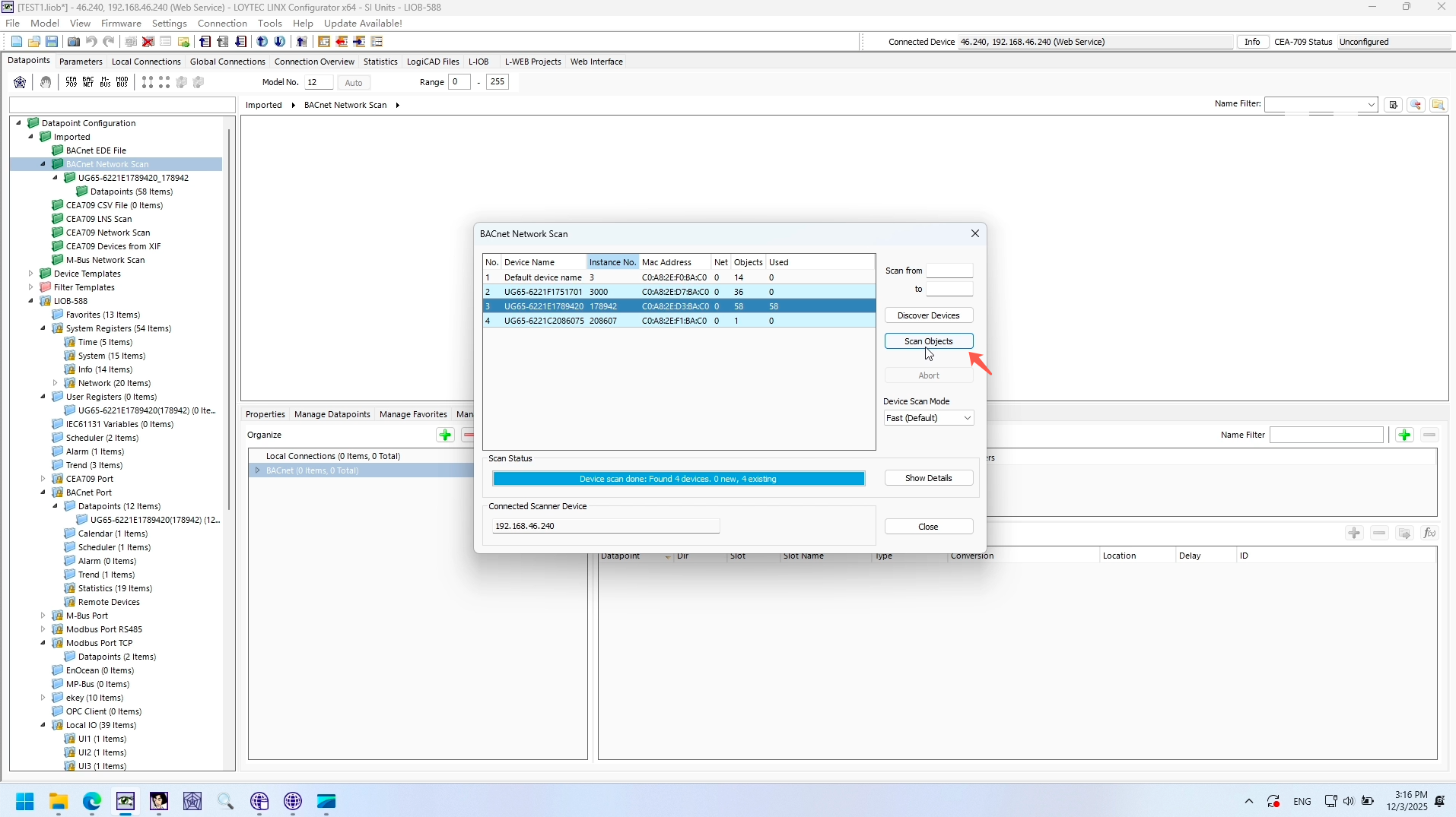 Choose the UG65 gateway, click 'Scan Objects', then close it.