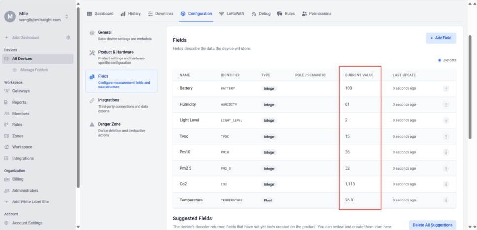 Scroll down the page, and you will see all the fields previously parsed by the decoder. Taking the AM308 as an example, you can select fields such as battery, temperature, humidity, etc. Choose the data you need and click Create Field.