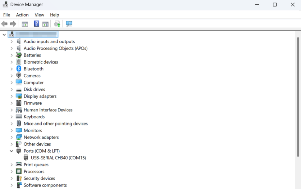 - 1. Open Device Manager to see if PC can recognize COM port. (CH340)
