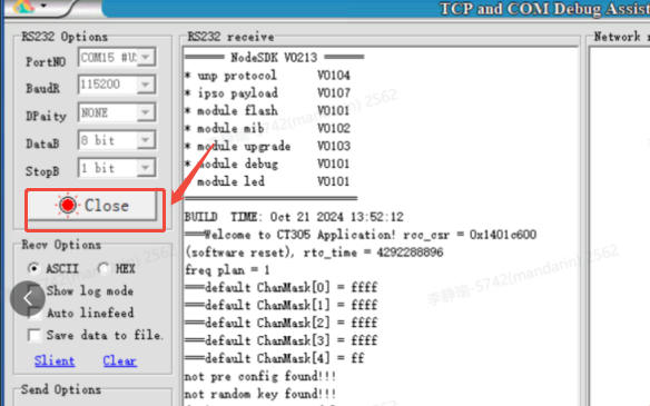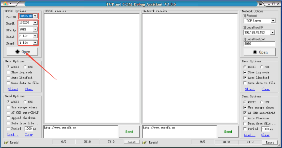 - 1. Choose the right com port and fill in the same parameters like this picture. Then click open.