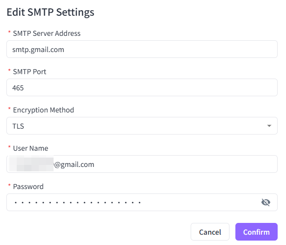 Configuring the SMTP information. The figure below uses Gmail as an example.